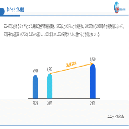 QYResearchが最新発表した「タイヤとゴム機械―グローバル市場シェアとランキング、全体の売上と需要予測、2026~2032」市場調査報告書によると、世界タイヤとゴム機械市場規模は2024年の約5909百万米ドルから2025年には6217百万米ドルへ着実に成長し、予測期間中に5.8%の複合年間成長率(CAGR)で拡大を続け、2031年には8720百万米ドルに達する見込みである。