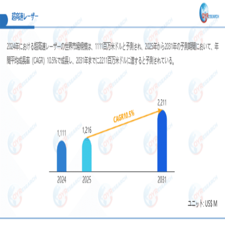 QYResearchが最新発表した「超高速レーザー―グローバル市場シェアとランキング、全体の売上と需要予測、2026~2032」市場調査報告書によると、世界超高速レーザー市場規模は2024年の約1111百万米ドルから2025年には1216百万米ドルへ着実に成長し、予測期間中に10.5%の複合年間成長率(CAGR)で拡大を続け、2031年には2211百万米ドルに達する見込みである。