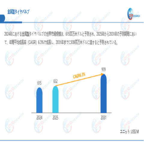 QYResearchが最新発表した「金属製タイヤバルブ―グローバル市場シェアとランキング、全体の売上と需要予測、2026~2032」市場調査報告書によると、世界金属製タイヤバルブ市場規模は2024年の約615百万米ドルから2025年には652百万米ドルへ着実に成長し、予測期間中に6.3%の複合年間成長率(CAGR)で拡大を続け、2031年には939百万米ドルに達する見込みである。