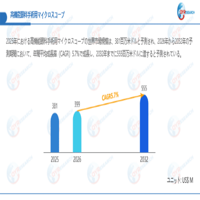 QYResearchが最新発表した「高機能眼科手術用マイクロスコープ―グローバル市場シェアとランキング、全体の売上と需要予測、2026~2032」市場調査報告書によると、世界高機能眼科手術用マイクロスコープ市場規模は2025年の約381百万米ドルから2026年には399百万米ドルへ着実に成長し、予測期間中に5.7%の複合年間成長率(CAGR)で拡大を続け、2032年に555百万米ドルに達する見込みである。