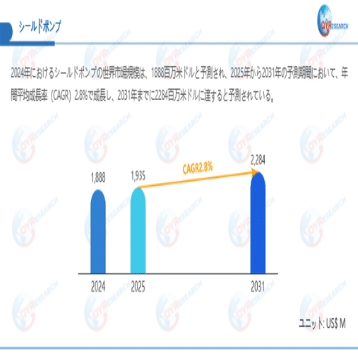 QYResearchが最新発表した「シールドポンプ―グローバル市場シェアとランキング、全体の売上と需要予測、2026~2032」市場調査報告書によると、世界シールドポンプ市場規模は2024年の約1888百万米ドルから2025年には1935百万米ドルへ着実に成長し、予測期間中に2.8%の複合年間成長率(CAGR)で拡大を続け、2031年には2284百万米ドルに達する見込みである。