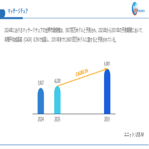 QYResearchが最新発表した「マッサージチェア―グローバル市場シェアとランキング、全体の売上と需要予測、2026~2032」市場調査報告書によると、世界マッサージチェア市場規模は2024年の約3927百万米ドルから2025年には4220百万米ドルへ着実に成長し、予測期間中に8.3%の複合年間成長率(CAGR)で拡大を続け、2031年には6801百万米ドルに達する見込みである。