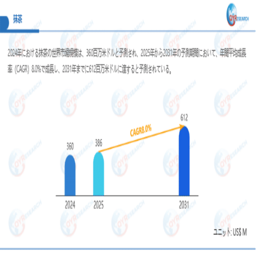 QYResearchが最新発表した「抹茶―グローバル市場シェアとランキング、全体の売上と需要予測、2026~2032」市場調査報告書によると、世界抹茶市場規模は2024年の約360百万米ドルから2025年には386百万米ドルへ着実に成長し、予測期間中に8%の複合年間成長率(CAGR)で拡大を続け、2031年には612百万米ドルに達する見込みである。
