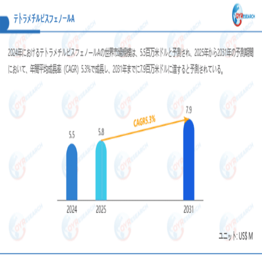 QYResearchが最新発表した「テトラメチルビスフェノールA―グローバル市場シェアとランキング、全体の売上と需要予測、2026~2032」市場調査報告書によると、世界テトラメチルビスフェノールA市場規模は2024年の約5.5百万米ドルから2025年には5.8百万米ドルへ着実に成長し、予測期間中に5.3%の複合年間成長率(CAGR)で拡大を続け、2031年には7.9百万米ドルに達する見込みである。