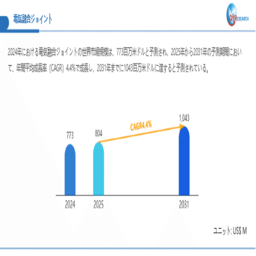 QYResearchが最新発表した「電気融合ジョイント―グローバル市場シェアとランキング、全体の売上と需要予測、2026~2032」市場調査報告書によると、世界電気融合ジョイント市場規模は2024年の約773百万米ドルから2025年には804百万米ドルへ着実に成長し、予測期間中に4.4%の複合年間成長率(CAGR)で拡大を続け、2031年には1043百万米ドルに達する見込みである。