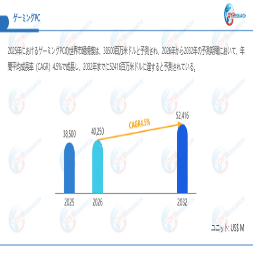 QYResearchが最新発表した「ゲーミングPC―グローバル市場シェアとランキング、全体の売上と需要予測、2026~2032」市場調査報告書によると、世界ゲーミングPC市場規模は2025年の約38500百万米ドルから2026年には40250百万米ドルへ着実に成長し、予測期間中に4.5%の複合年間成長率(CAGR)で拡大を続け、2032年には52416百万米ドルに達する見込みである。