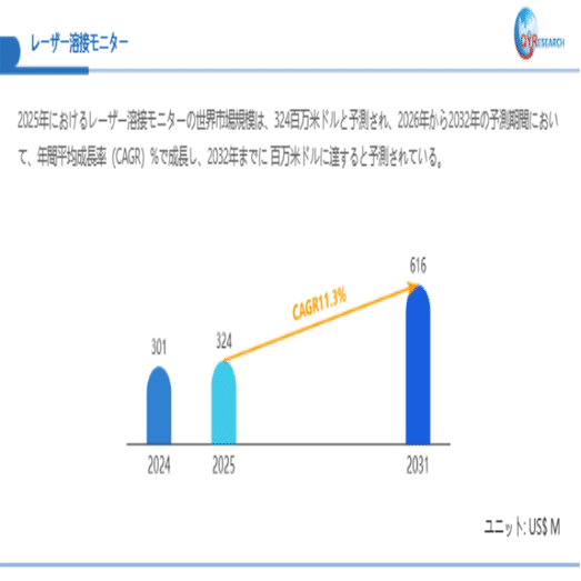 QYResearchが最新発表した「レーザー溶接モニター―グローバル市場シェアとランキング、全体の売上と需要予測、2026~2032」市場調査報告書によると、世界レーザー溶接モニター市場規模は2024年の約301百万米ドルから2025年には324百万米ドルへ着実に成長し、予測期間中に11.3%の複合年間成長率(CAGR)で拡大を続け、 2031年には616百万米ドルに達する見込みである。