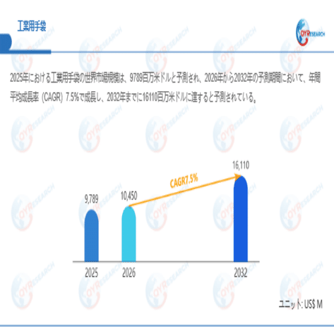 QYResearchが最新発表した「工業用手袋―グローバル市場シェアとランキング、全体の売上と需要予測、2026~2032」市場調査報告書によると、世界工業用手袋市場規模は2025年の約9789百万米ドルから2026年には10450百万米ドルへ着実に成長し、予測期間中に7.5%の複合年間成長率(CAGR)で拡大を続け、2032年に16110百万米ドルに達する見込みである。