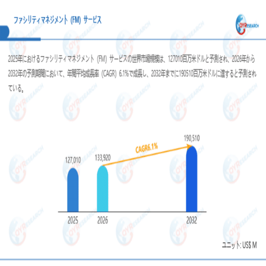 QYResearchが最新発表した「ファシリティマネジメント(FM)サービス―グローバル市場シェアとランキング、全体の売上と需要予測、2026~2032」市場調査報告書によると、世界ファシリティマネジメント(FM)サービス市場規模は2025年の約127010百万米ドルから2026年には133920百万米ドルへ着実に成長し、予測期間中に6.1%の複合年間成長率(CAGR)で拡大を続け、2032年には190510百万米ドルに達する見込みである。