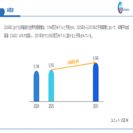 QYResearchが最新発表した「床暖房―グローバル市場シェアとランキング、全体の売上と需要予測、2026~2032」市場調査報告書によると、世界床暖房市場規模は2024年の約5194百万米ドルから2025年には5355百万米ドルへ着実に成長し、予測期間中に3.4%の複合年間成長率(CAGR)で拡大を続け、 2031年には6560百万米ドルに達する見込みである。
