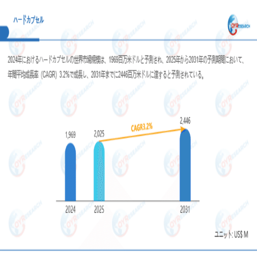 QYResearchが最新発表した「ハードカプセル―グローバル市場シェアとランキング、全体の売上と需要予測、2026~2032」市場調査報告書によると、世界ハードカプセル市場規模は2024年の約1969百万米ドルから2025年には2025百万米ドルへ着実に成長し、予測期間中に3.2%の複合年間成長率(CAGR)で拡大を続け、2031年には2446百万米ドルに達する見込みである。