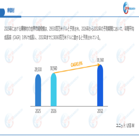 世界の自動車産業が電動化・知能化へ転換し、軌道交通が持続的に拡大する背景のもと、摩擦材は制動の安全性と効率を確保する中核機能部品として、その市場は構造的な変革を経験している。QYResearchが最新発表した「摩擦材―グローバル市場シェアとランキング、全体の売上と需要予測、2026~2032」市場調査報告書によると、世界摩擦材市場規模は2025年の約29530百万米ドルから2026年には30560百万米ドルへ着実に成長し、予測期間中に3.9%の複合年間成長率(CAGR)で拡大を続け、2032年に38360百万米ドルに達する見込みである。