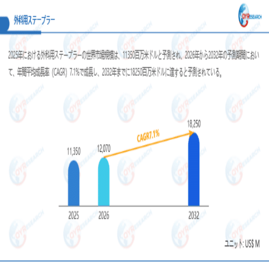 QYResearchが最新発表した「外科用ステープラー―グローバル市場シェアとランキング、全体の売上と需要予測、2026~2032」市場調査報告書によると、世界外科用ステープラー市場規模は2025年の約11350百万米ドルから2026年には12070百万米ドルへ着実に成長し、予測期間中に7.1%の複合年間成長率(CAGR)で拡大を続け、2032年には18250百万米ドルに達する見込みである。