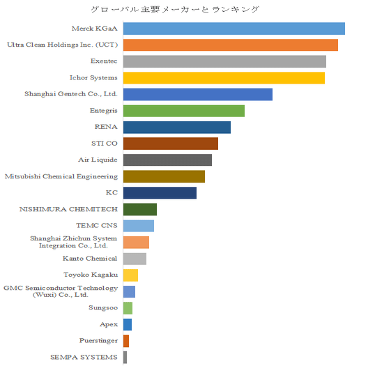 QYResearchのトップ企業研究センターによれば、薬液供給システムの世界的主要製造業者にはMerck KGaA、Ultra Clean Holdings Inc.(UCT)、Exentec、Ichor Systems、Shanghai Gentech Co., Ltd.、Entegris、RENA、STI CO、Air Liquide、Mitsubishi Chemical Engineering等が含まれる。2025年時点でトップ5企業は売上観点から約57.0%の市場シェアを持ち、トップ10企業は約80.0%の市場シェアを持つとされる。これは、当該領域が“設計・製造・品質保証・現地立上げ”までを要求するシステム財であり、顧客側の工程リスク許容度が低いことから、実績と供給能力を備えた企業へ集約しやすい構造を示す。上位企業の顔ぶれが素材・ガス・装置周辺の領域にまたがる点も、薬液供給が単独製品ではなく、プロセスインフラとしての統合提案力を競う市場であることを裏付ける。