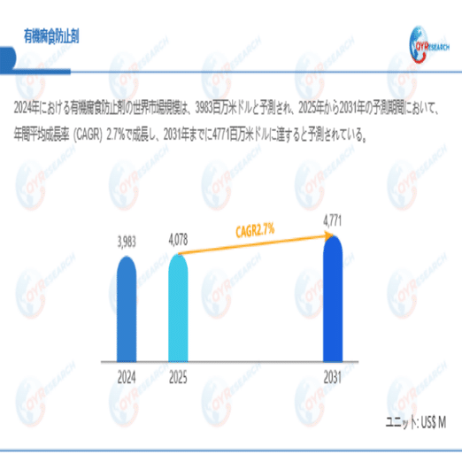 QYResearchが最新発表した「有機腐食防止剤―グローバル市場シェアとランキング、全体の売上と需要予測、2026~2032」市場調査報告書によると、世界有機腐食防止剤市場規模は2024年の約3983百万米ドルから2025年には4078百万米ドルへ着実に成長し、予測期間中に2.7%の複合年間成長率(CAGR)で拡大を続け、2031年には4771百万米ドルに達する見込みである。