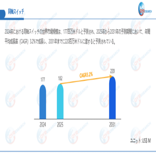 QYResearchが最新発表した「同軸スイッチ―グローバル市場シェアとランキング、全体の売上と需要予測、2026~2032」市場調査報告書によると、世界同軸スイッチ市場規模は2024年の約117百万米ドルから2025年には182百万米ドルへ着実に成長し、予測期間中に3.2%の複合年間成長率(CAGR)で拡大を続け、2031年には220百万米ドルに達する見込みである。