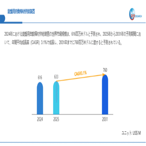QYResearchが最新発表した「旋盤用自動棒材供給装置―グローバル市場シェアとランキング、全体の売上と需要予測、2026~2032」市場調査報告書によると、世界旋盤用自動棒材供給装置市場規模は2024年の約616百万米ドルから2025年には633百万米ドルへ着実に成長し、予測期間中に3.1%の複合年間成長率(CAGR)で拡大を続け、2031年には760百万米ドルに達する見込みである。