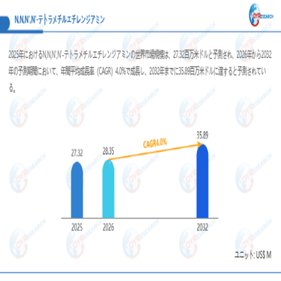 QYResearchが最新発表した「N,N,N',N'-テトラメチルエチレンジアミン―グローバル市場シェアとランキング、全体の売上と需要予測、2026~2032」市場調査報告書によると、世界N,N,N',N'-テトラメチルエチレンジアミン市場規模は2025年の約27.32百万米ドルから2026年には28.35百万米ドルへ着実に成長し、予測期間中に4.0%の複合年間成長率(CAGR)で拡大を続け、2032年に35.89百万米ドルに達する見込みである。