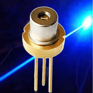 レーザーダイオードは電気励起型半導体レーザーであり、p-n接合または(より頻繁に)p-i-n構造を流れる電流によって利得が生成される。このようなヘテロ構造では、電子と正孔が再結合し、エネルギーの一部を光子として放出する。この過程は自発的に起こることもあれば、入射光子によって励起されることもあり、結果として光増幅をもたらし、レーザー共振器内での光フィードバックによりレーザー発振に至る。青色レーザーダイオードは405~483ナノメートルの波長を持つ電磁放射を放射し、これは人間の目には青色または紫色として認識される。単一モード青色レーザーダイオードは伝播する光のモードが一つだけである。