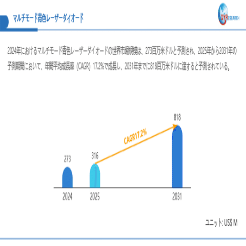 QYResearchが最新発表した「マルチモード青色レーザーダイオード―グローバル市場シェアとランキング、全体の売上と需要予測、2026~2032」市場調査報告書によると、世界マルチモード青色レーザーダイオード市場規模は2024年の約273百万米ドルから2025年には316百万米ドルへ着実に成長し、予測期間中に17.2%の複合年間成長率(CAGR)で拡大を続け、2031年には818百万米ドルに達する見込みである。