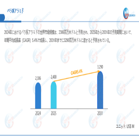 QYResearchが最新発表した「パラ系アラミド―グローバル市場シェアとランキング、全体の売上と需要予測、2026~2032」市場調査報告書によると、世界パラ系アラミド市場規模は2024年の約2306百万米ドルから2025年には2400百万米ドルへ着実に成長し、予測期間中に5.4%の複合年間成長率(CAGR)で拡大を続け、2031年には3290百万米ドルに達する見込みである。