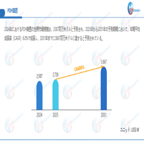 QYResearchが最新発表した「PDH装置―グローバル市場シェアとランキング、全体の売上と需要予測、2026~2032」市場調査報告書によると、世界PDH装置市場規模は2024年の約2587百万米ドルから2025年には2726百万米ドルへ着実に成長し、予測期間中に6%の複合年間成長率(CAGR)で拡大を続け、2031年には3867百万米ドルに達する見込みである。