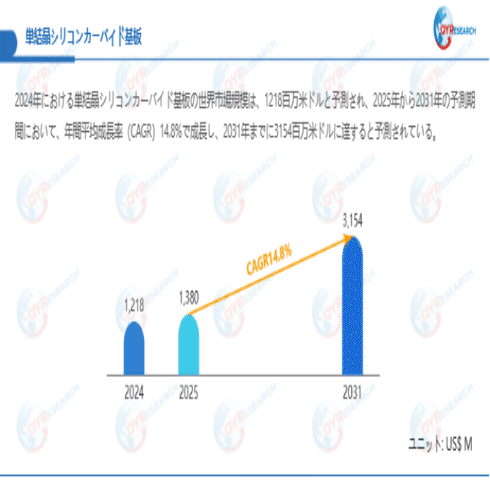 QYResearchが最新発表した「単結晶シリコンカーバイド基板―グローバル市場シェアとランキング、全体の売上と需要予測、2026~2032」市場調査報告書によると、世界単結晶シリコンカーバイド基板市場規模は2024年の約1218百万米ドルから2025年には1380百万米ドルへ着実に成長し、予測期間中に14.8%の複合年間成長率(CAGR)で拡大を続け、2031年には3154百万米ドルに達する見込みである。