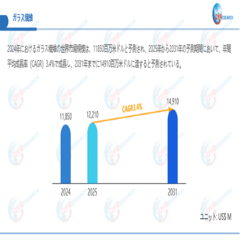 QYResearchが最新発表した「ガラス繊維―グローバル市場シェアとランキング、全体の売上と需要予測、2026~2032」市場調査報告書によると、世界ガラス繊維市場規模は2024年の約11850百万米ドルから2025年には12210百万米ドルへ着実に成長し、予測期間中に3.4%の複合年間成長率(CAGR)で拡大を続け、2031年には14910百万米ドルに達する見込みである。