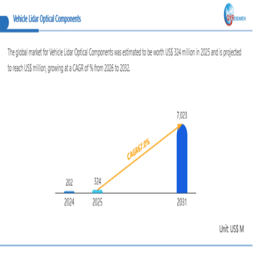 QYResearchが最新発表した「車載用ライダー光学部品―グローバル市場シェアとランキング、全体の売上と需要予測、2026~2032」市場調査報告書によると、世界車載用ライダー光学部品市場規模は2024年の約202百万米ドルから2025年には324百万米ドルへ着実に成長し、予測期間中に67%の複合年間成長率(CAGR)で拡大を続け、 2031年には7023百万米ドルに達する見込みである。