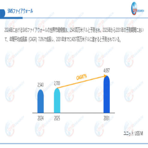 QYResearchが最新発表した「SMSファイアウォール―グローバル市場シェアとランキング、全体の売上と需要予測、2026~2032」市場調査報告書によると、世界SMSファイアウォール市場規模は2024年の約2543百万米ドルから2025年には2703百万米ドルへ着実に成長し、予測期間中に7%の複合年間成長率(CAGR)で拡大を続け、2031年には4057百万米ドルに達する見込みである。
