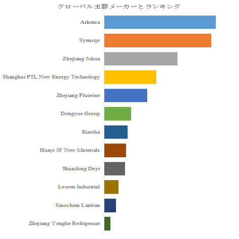 PVDF市場は国際的に多様なプレイヤーが競合するが、上位企業による市場支配力が強い構造となっている。Arkema、Svensqo、Zhejiang Juhua、Shanghai PTL New Energy Technologyなどが主要な市場シェアを占めている。Arkemaは高性能フッ素ポリマー市場で長年の実績を持ち、耐久性と品質で評価されており、特にバッテリーグレードPVDFの供給能力を強化している。Zhejiang JuhuaやZhejiang Fluorineはアジア市場を中心に供給網を拡大しており、急速な地域需要の増加に対応する体制を構築している。Dongyue Group、Huayi 3F New Materials、Shandong Deyiなどの中国系メーカーはコスト競争力と規模の経済を活かし、ローカル市場でのプレゼンスを高めている。Kurehaは長年にわたる材料開発力と品質管理で高付加価値用途に強く、世界的な顧客基盤を有している。またLecron IndustrialやSinochem Lantian、Zhejiang Yonghe Refrigerantといった企業も特定用途向けに競争力を発揮している。この市場環境では、上位企業が大規模設備投資と供給安定性で優位を持ちながら、中堅企業がニッチ市場で存在感を示す多極的な競争構造が形成されている。