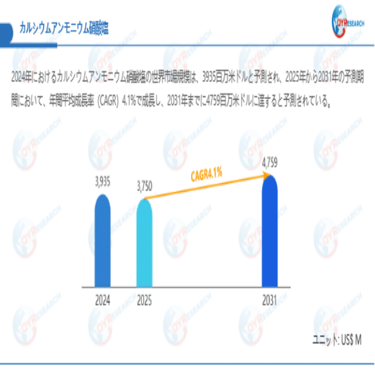 QYResearchが最新発表した「カルシウムアンモニウム硝酸塩―グローバル市場シェアとランキング、全体の売上と需要予測、2026~2032」市場調査報告書によると、世界カルシウムアンモニウム硝酸塩市場規模は2024年の約3935百万米ドルから2025年には3750百万米ドルへ着実に成長し、予測期間中に4.1%の複合年間成長率(CAGR)で拡大を続け、2031年には4759百万米ドルに達する見込みである。