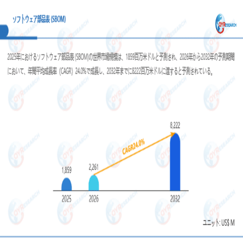 QYResearchが最新発表した「ソフトウェア部品表 (SBOM)―グローバル市場シェアとランキング、全体の売上と需要予測、2026~2032」市場調査報告書によると、世界ソフトウェア部品表 (SBOM)市場規模は2025年の約1859百万米ドルから2026年には2261百万米ドルへ着実に成長し、予測期間中に24%の複合年間成長率(CAGR)で拡大を続け、2032年に8222百万米ドルに達する見込みである。