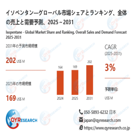 QYResearchが最新発表した「イソペンタン―グローバル市場シェアとランキング、全体の売上と需要予測、2025~2031」市場調査報告書によると、世界イソペンタン市場規模は2024年の約164百万米ドルから2025年には169百万米ドルへ着実に成長し、予測期間中に3%の複合年間成長率(CAGR)で拡大を続け、2031年に202百万米ドルに達する見込みである。