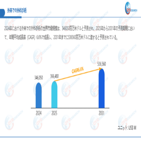 QYResearchが最新発表した「外来での外科手術―グローバル市場シェアとランキング、全体の売上と需要予測、2026~2032」市場調査報告書によると、世界外来での外科手術市場規模は2024年の約346050百万米ドルから2025年には366480百万米ドルへ着実に成長し、予測期間中に6.6%の複合年間成長率(CAGR)で拡大を続け、2031年には536560百万米ドルに達する見込みである。