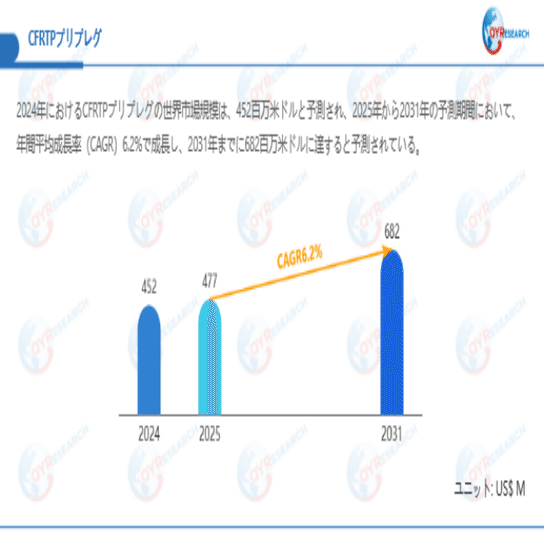 QYResearchが最新発表した「CFRTPプリプレグ―グローバル市場シェアとランキング、全体の売上と需要予測、2026~2032」市場調査報告書によると、世界CFRTPプリプレグ市場規模は2024年の約452百万米ドルから2025年には477百万米ドルへ着実に成長し、予測期間中に6.2%の複合年間成長率(CAGR)で拡大を続け、2031年には682百万米ドルに達する見込みである。