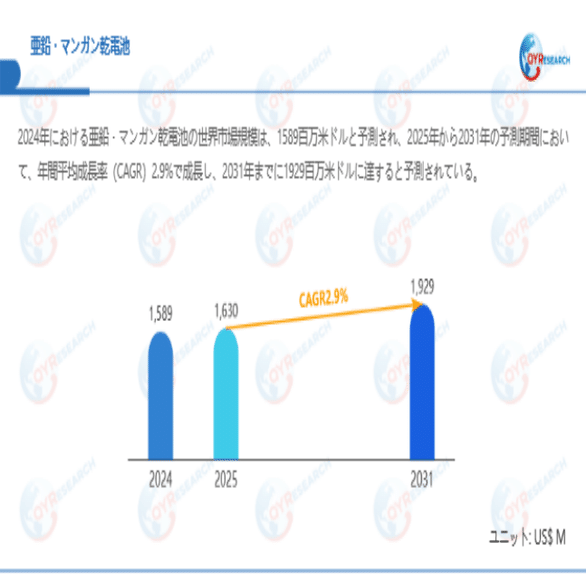 QYResearchが最新発表した「亜鉛・マンガン乾電池―グローバル市場シェアとランキング、全体の売上と需要予測、2026~2032」市場調査報告書によると、世界亜鉛・マンガン乾電池市場規模は2024年の約1589百万米ドルから2025年には1630百万米ドルへ着実に成長し、予測期間中に2.9%の複合年間成長率(CAGR)で拡大を続け、2031年には1929百万米ドルに達する見込みである。